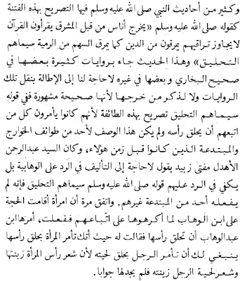 أتينا بدلائل على أن الوهابية هم الخوارج المقصودون بوصف: سيماهم التحليق، من كتب الوهابية نفسهم، ومن ردود علماء أهل السنة المعاصرين لهم، ومن كتب المستشرقين الذين تواجدوا في شبه الجزيرة العربية بذلك الوقت الذين وصفوا شكل مجتمع لا يعرفوا شيئاً عن الحديث ولا غيره.