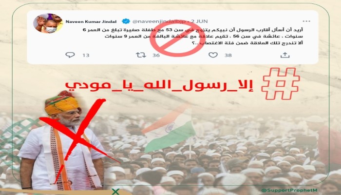 Read Moreالخليج الجديد : “إلا رسول الله يا مودي”.. وسم تصدر مواقع التواصل الاجتماعي حول العالم، على خلفية تغريدة مسيئة للنبي…