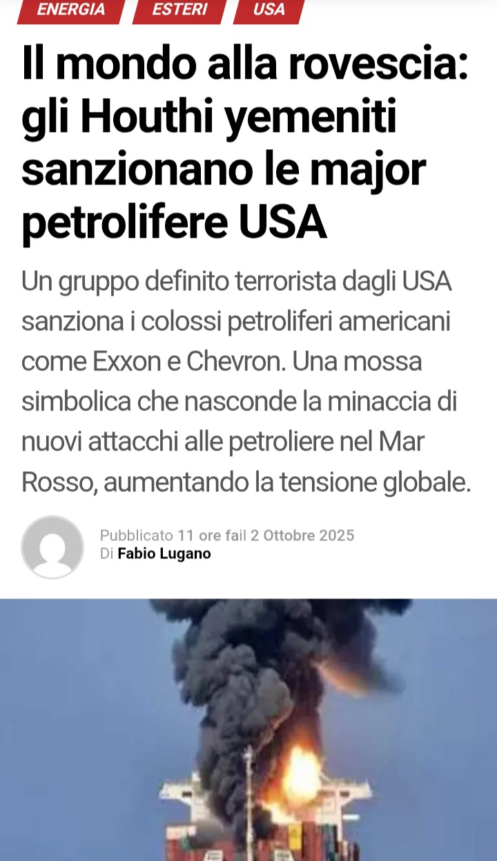أفادت مجلة “سيناري إيكونوميك (Scenari Economici)” الإيطالية في تقرير لها أمس الخميس، أن جماعة الحوثي اليمنية، التي تُصنّفها الولايات المتحدة كمنظمة إرهابية، قد فرضت عقوبات على عدد من شركات النفط الأمريكية الكبرى، بما في ذلك عملاقي الطاقة إكسون موبيل وشيفرون.